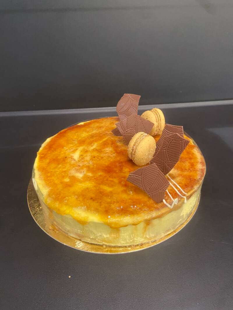 Biscuit aux amandes, crème mousseline à la vanille, framboises entières légèrement caramélisé sur le dessus.