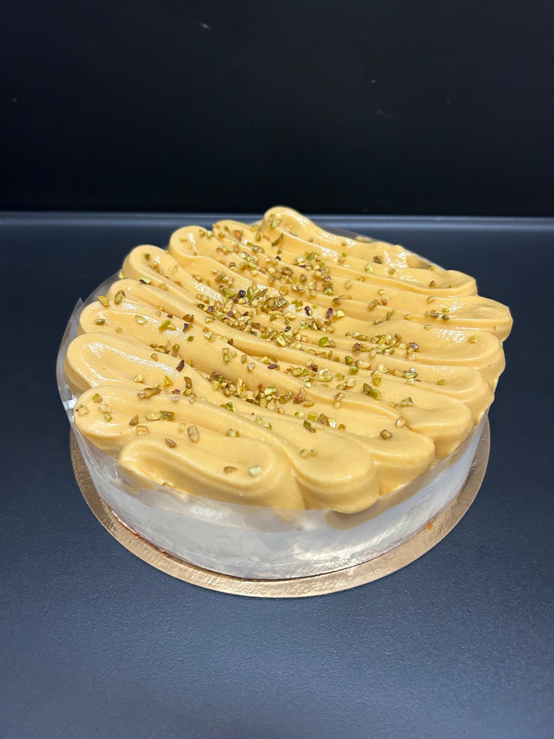 Glace à la vanille, sorbet à l'abricot et biscuit moelleux à la pistache.
